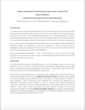 The study done by GCAP Afghanistan/Sanayee Development Organisation brings out the facts and analysis about the exclusion and discrimination faced by some of the marginalised groups in Afghanistan like women and girls, old people, children and young people, religious and ethnic minorities etc and explores the opportunities lying ahead in the framework of Agenda 2030 to address their issues so that they are not left behind.